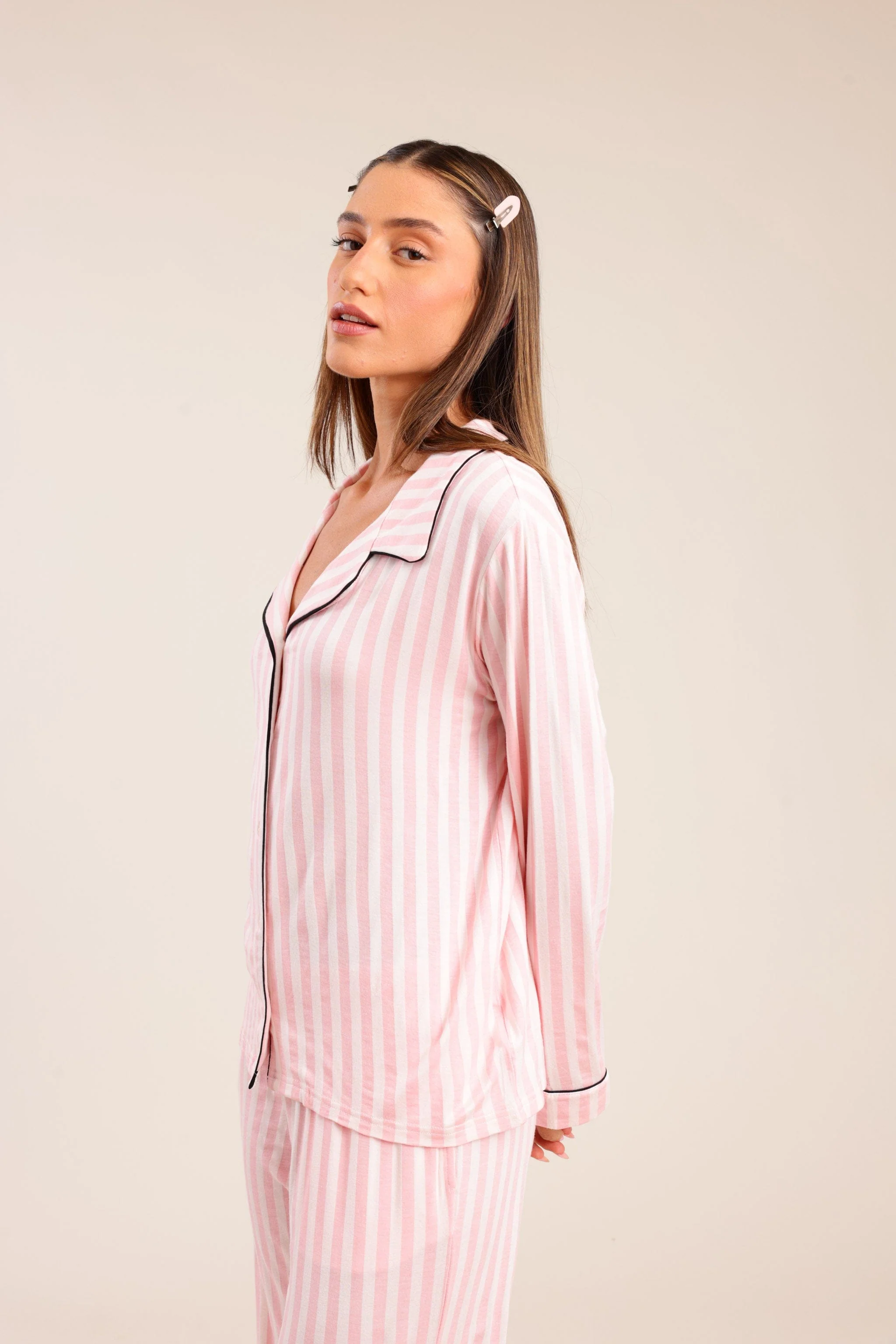 הסט כולל מכנס ארוך בגזרה רפויה ונעימה, עם חולצה תואמת ארוכה עם שרוול מלא, פתיחה קדמית מלאה עם כפתורים