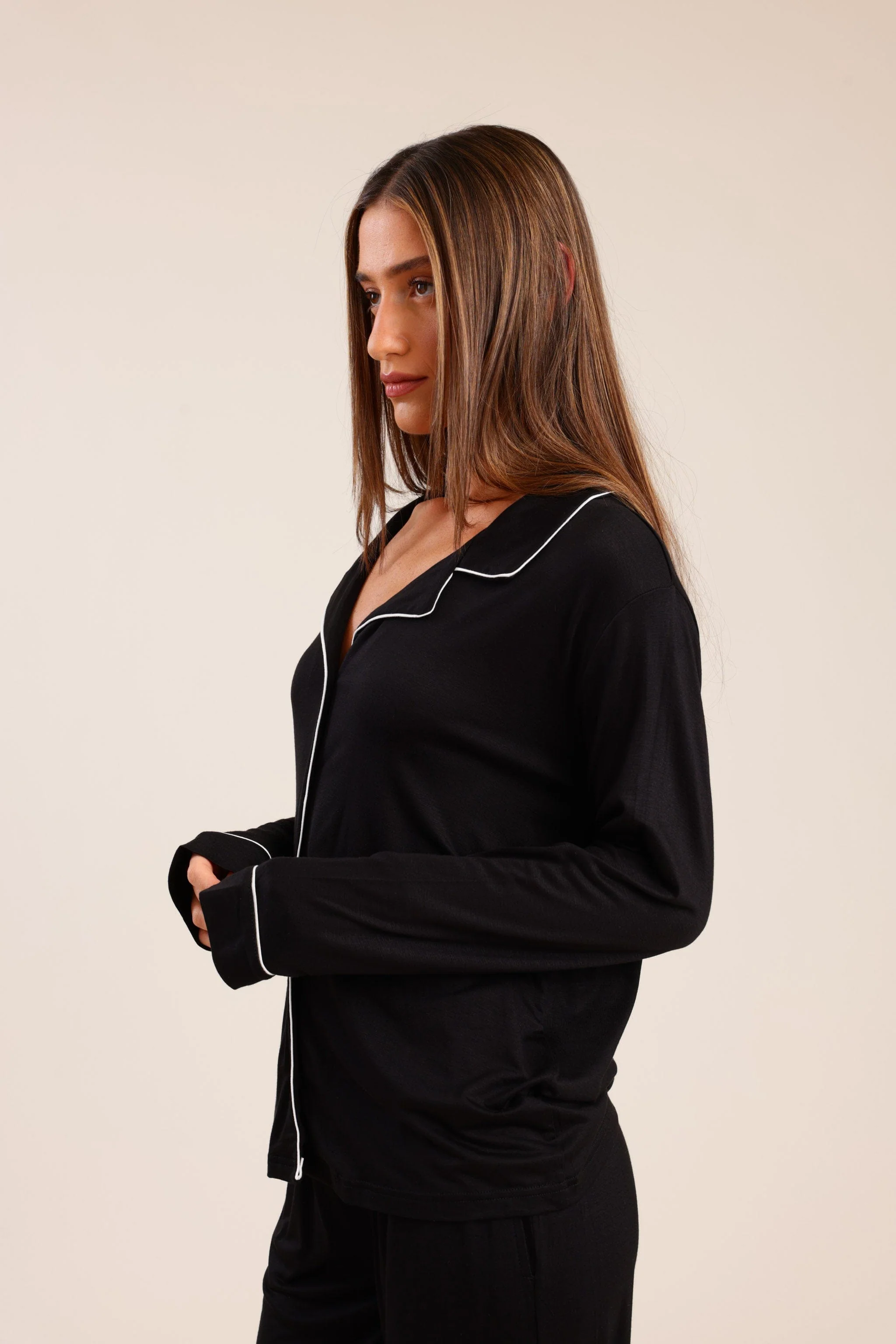 הסט כולל מכנס ארוך בגזרה רפויה ונעימה, עם חולצה תואמת ארוכה עם שרוול מלא, פתיחה קדמית מלאה עם כפתורים